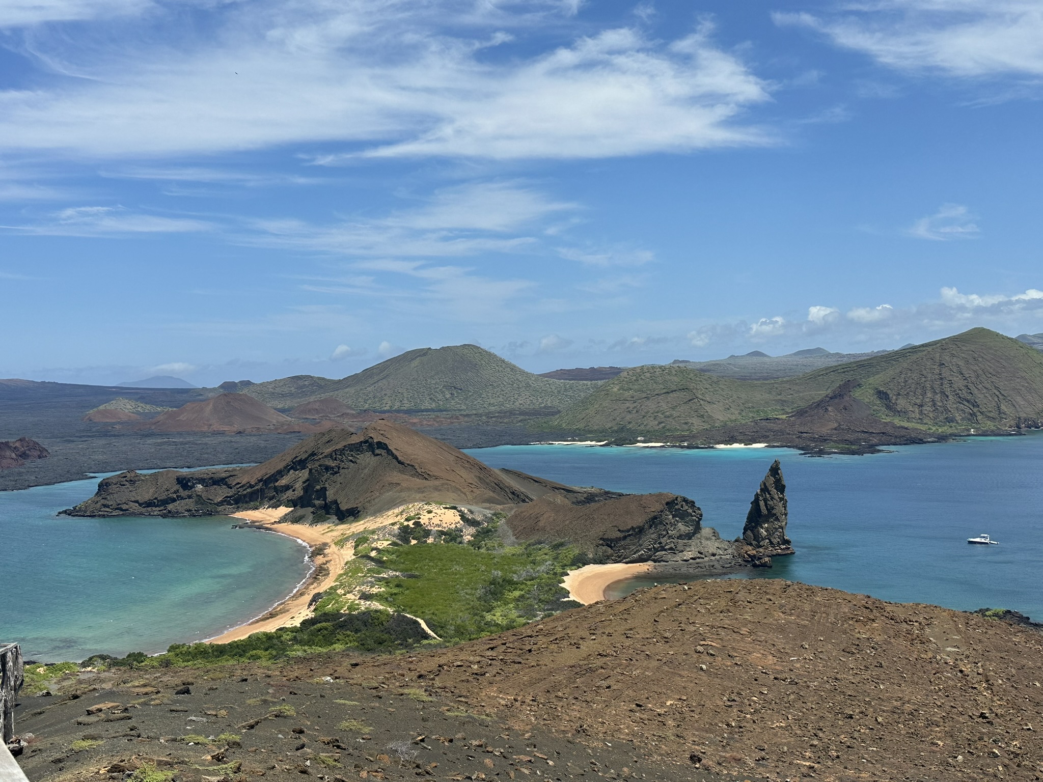 The island’s iconic landmark, Pinnacle Rock, juts sharply from the sea, framed by twin crescent bays. It’s the most photographed spot in the Galápagos, and standing at its viewpoint after a hike up 376 wooden steps, we could see why.
